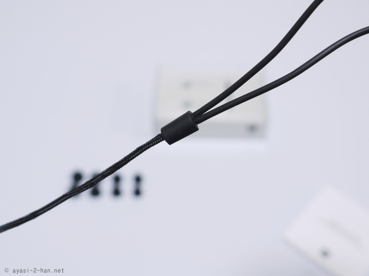 分岐点から左右のイヤホン本体までのケーブルは左右均等なタイプで、長さは30~33cmくらいでした。
